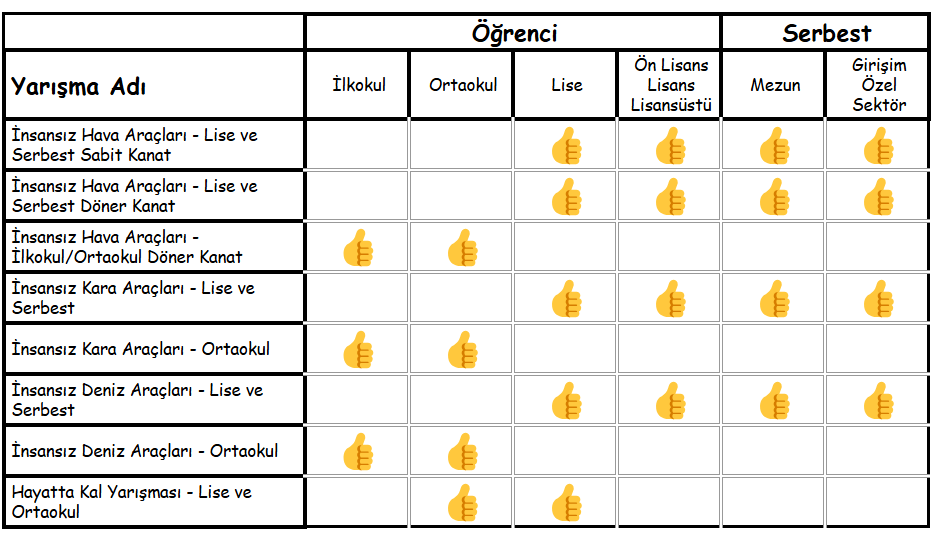 - İnsansız Hava Araçları Şartnameleri: Lise ve Serbest Sabit Kanat | Lise ve Serbest Döner Kanat | İlkokul-Ortaokul Döner Kanat